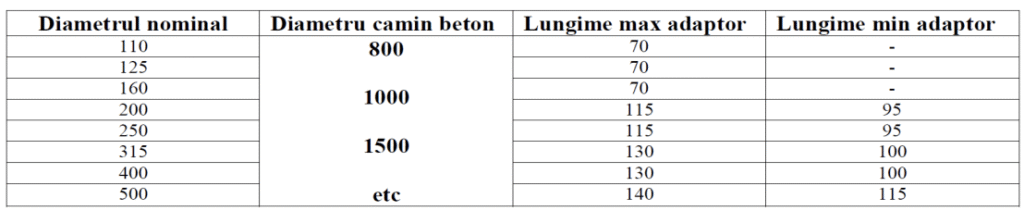 Adaptorul pvc pentru camine din beton este o piesa de legatura intre tevile din PVC-U multistrat sau compacte, colectoare stradale sau de la utilizatori si canalele de racord, camine din beton, cu mufa si garnitura elastomerica, avand suprafata interioara neteda si cea exterioara acoperita cu un strat de silicat cuartos care sa permita adezivului să lipească adaptorul de betonul caminului. Adaptoarele produse in cadrul programului TUBIN sunt: